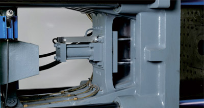 采用雙射移(yi)結構,前拉式射臺油(you)缸,平行牽引,保(bao)護噴嘴與模具接觸不(bu)偏移(yi)密封佳,不(bu)易漏膠。